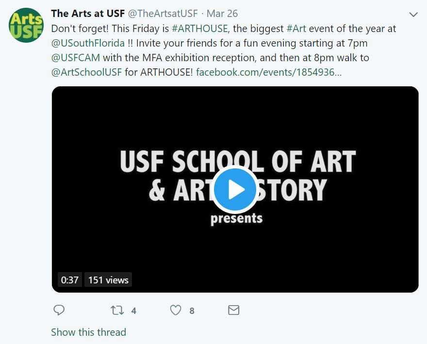 ArtHouse was the featured event for the School of Art & Art History in the monthly email calendar sent to subscribers around the Tampa Bay area. The Arts Monthly has an established list of subscribers interested in all events from the College of The Arts.