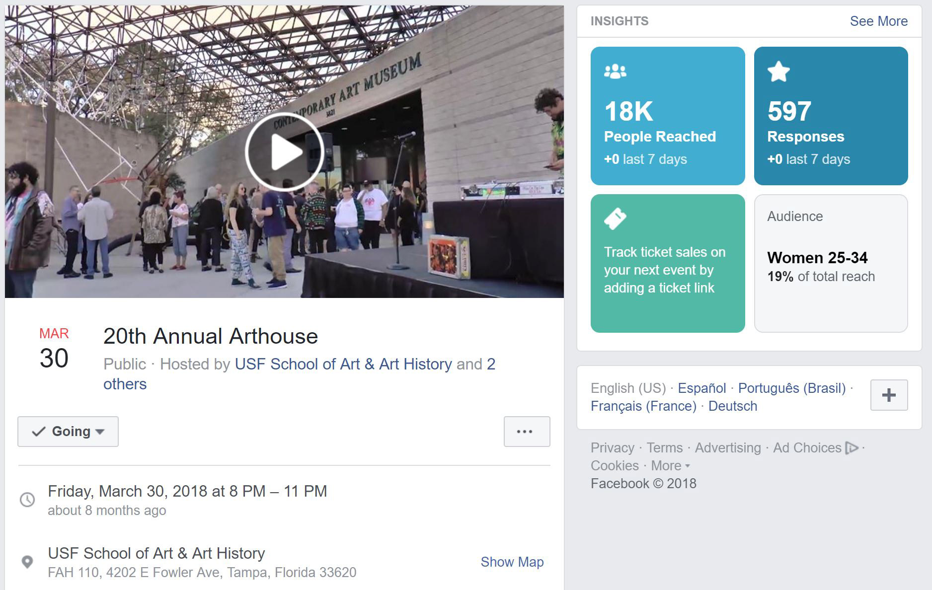 A Facebook event was set up as co-hosted by the School of Art & Art History, the College of The Arts and the Contemporary Art Museum to reach audiences among all three pages and share metrics.