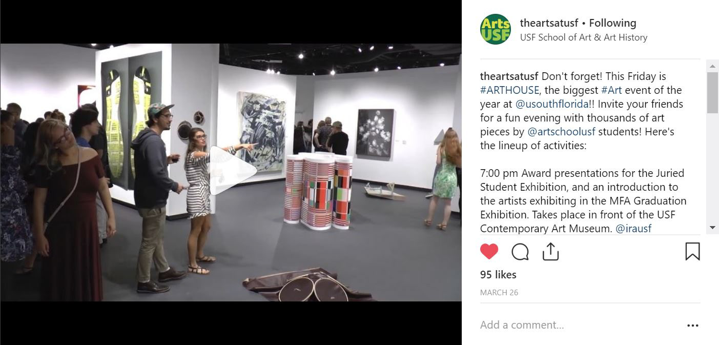 With the additional marketing reach, we were also able to raise awareness among our USF community that the university has an art program on the Tampa campus. As a result, part of our event attendance increase was due to an increase in participation from more student clubs not affiliated to the School of Art & Art History.