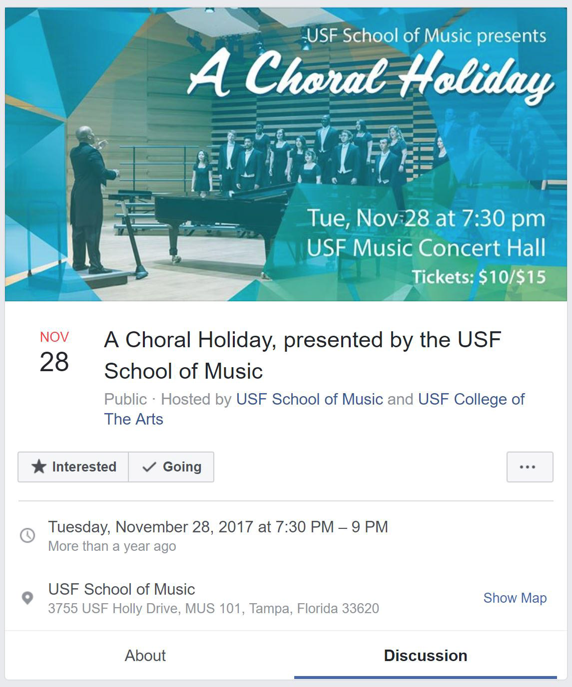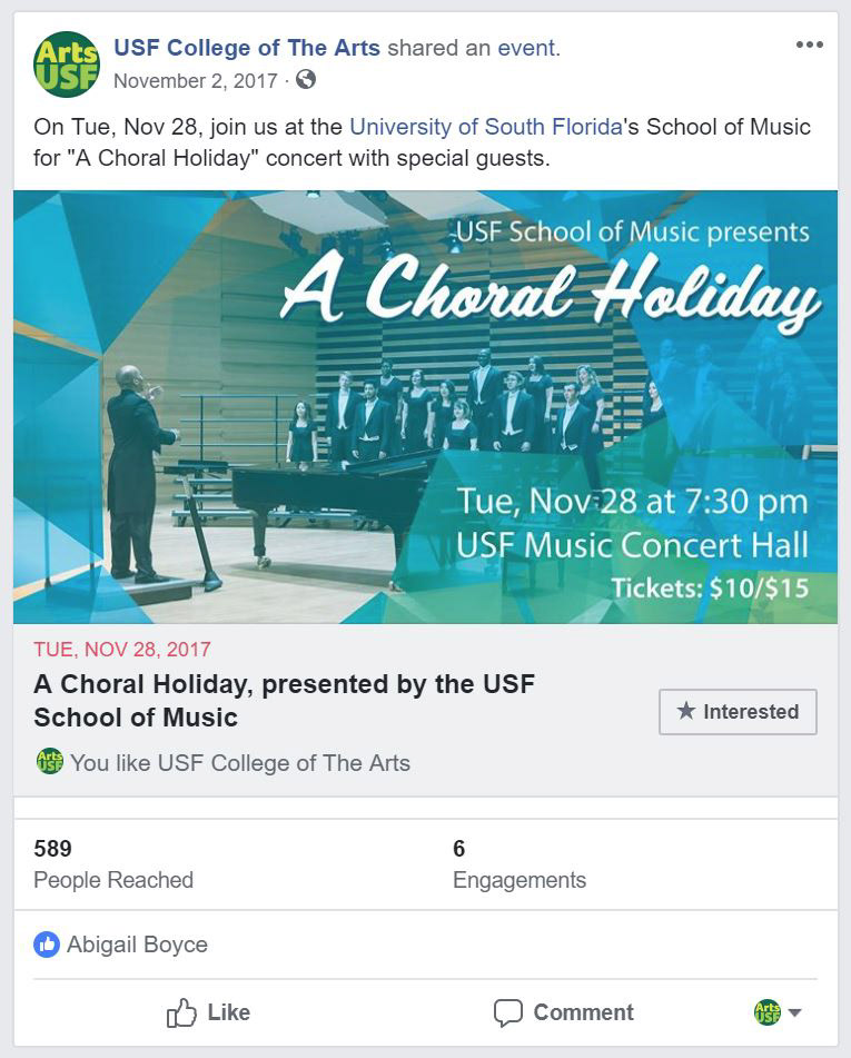 A Facebook event was set up as co-hosted by the School of Music and the College of The Arts to reach audiences among both pages and share metrics.