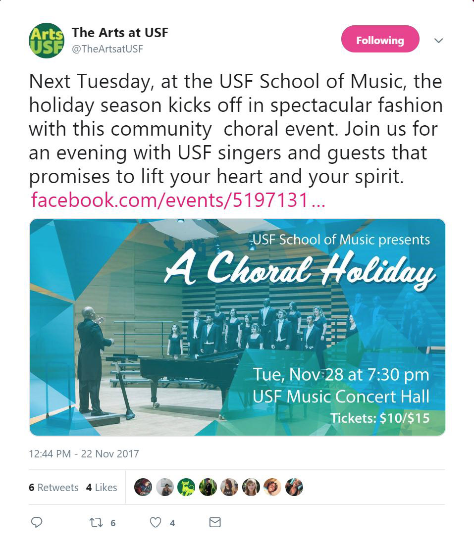 Choral Holiday was the featured event for the School of Music in the Nov-Dec 2017 email calendar sent to subscribers around the Tampa Bay area. The Arts Monthly has an established list of subscribers interested in all events from the College of The Arts.