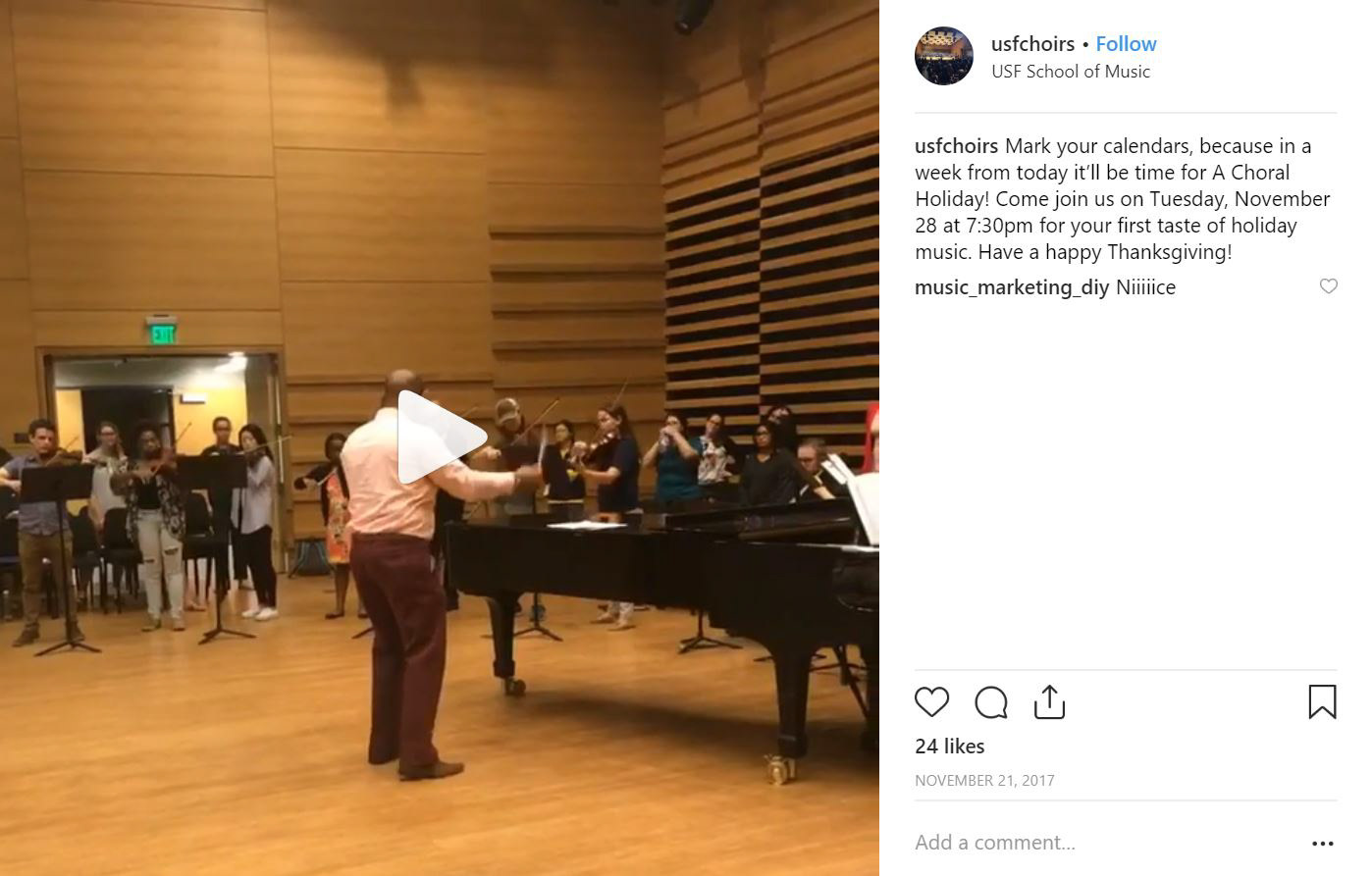 The annual Choral Holiday concert at the USF School of Music is an audience favorite for starting off the holiday season. USF Choral ensembles team up with community choirs and invite guest performers from other groups at USF. The choirs present exciting arrangements of holiday classics as well as original works from contemporary composers.