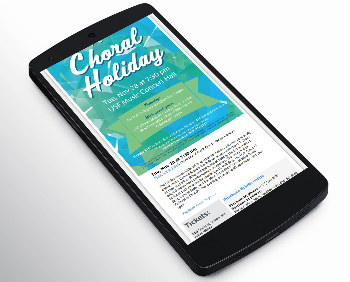 Choral Holiday received the front cover feature on the Nov-Dec 2017 edition of the quarterly print calendar for all college events. This piece was direct mailed to an established list of subscribers, and available at information desks across the USF campus and in tourism centers around the Tampa Bay area.