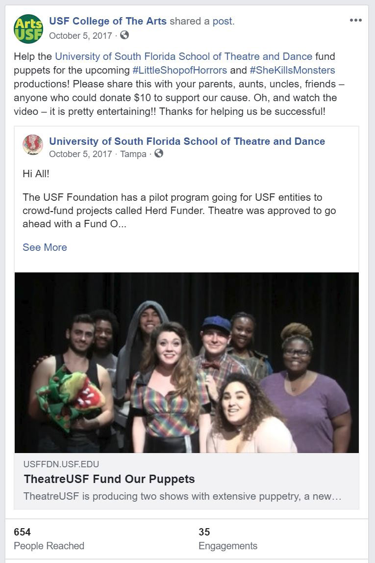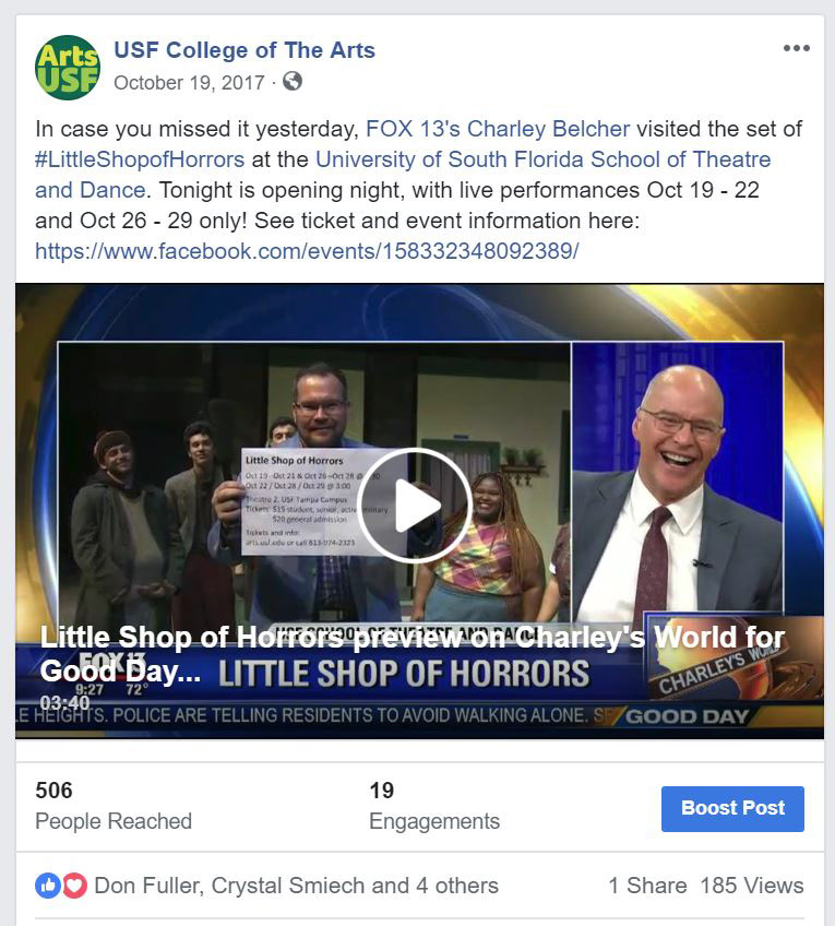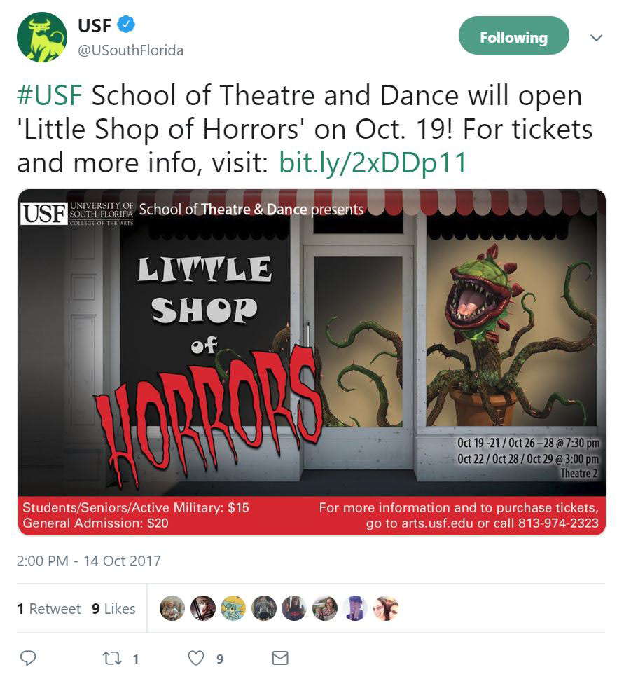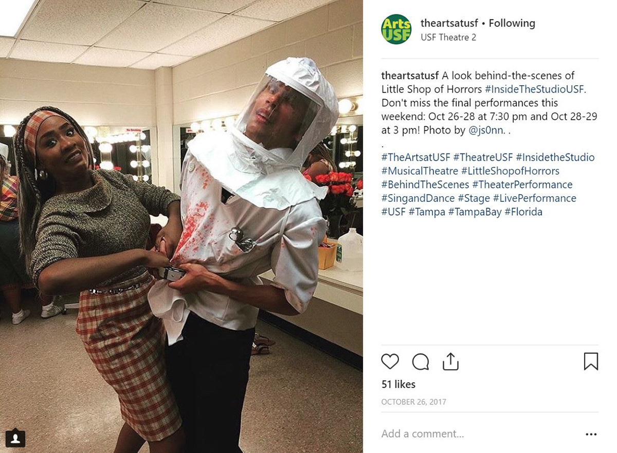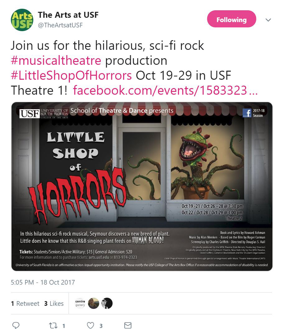 Little Shop of Horrors was the featured event for the School of Theatre & Dance in the October 2017 email calendar sent to subscribers around the Tampa Bay area. The Arts Monthly has an established list of subscribers interested in all events from the College of The Arts.