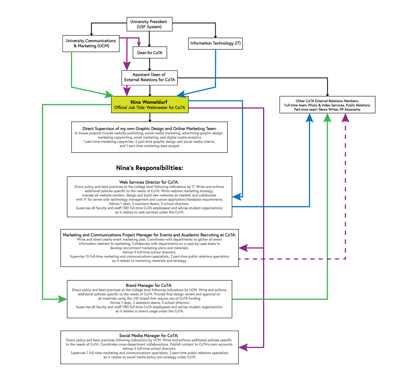 The chart below shows my current marketing and communications role at the USF College of The Arts. When I was originally hired, my position only consisted of the Web Services aspects and the college did not have an External Relations department. Over the course of 10 years, I inherited oversight of some marketing and communications tasks. I also earned the opportunity to directly influence the strategic efforts, and grow my own in-house team.