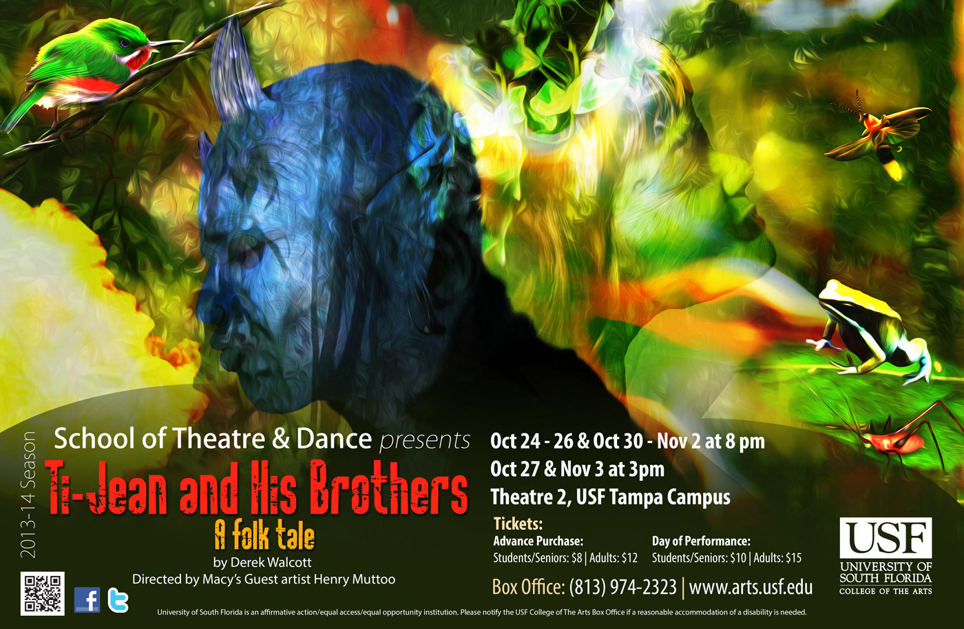 The photo composite illustration for the play "Ti-Jean and His Brothers" depicts the folk tale told by the animals of the rainforest of a poor widowed mother, her three sons and their bargain with the devil. This artwork was used in the University of South Florida's School of Theatre and Dance 2013-14 performance season.