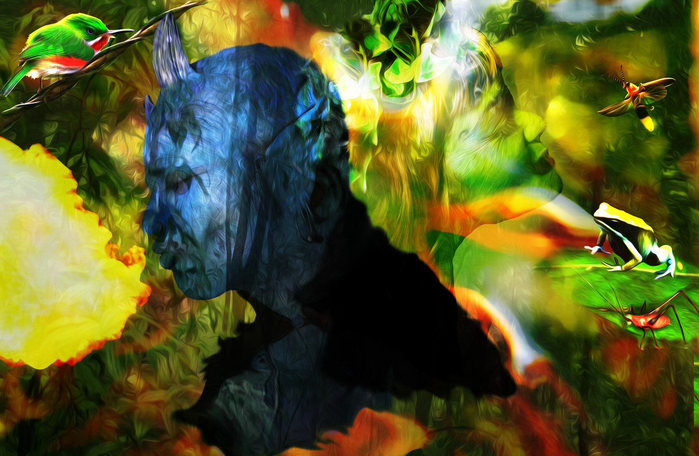Photo composite illustration featuring the rain forest, the animals telling the story, the mother and the devil.